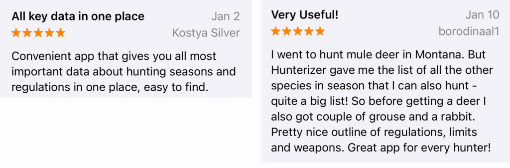 Get a personalized list of what’s in-season right now based on your selected filters—zone, species, weapon, and hunter type. Always know what’s legal today.
