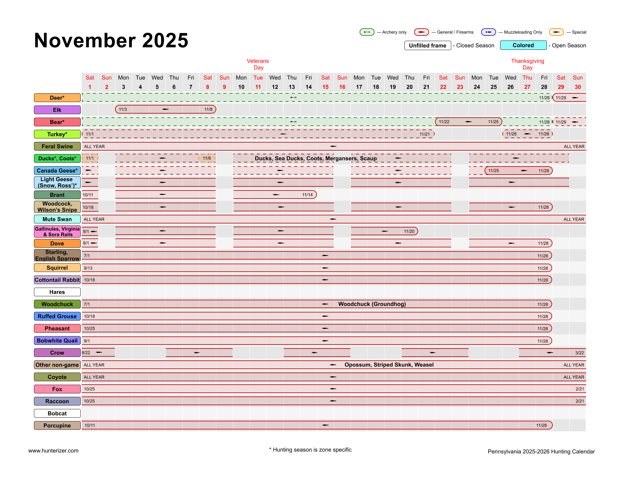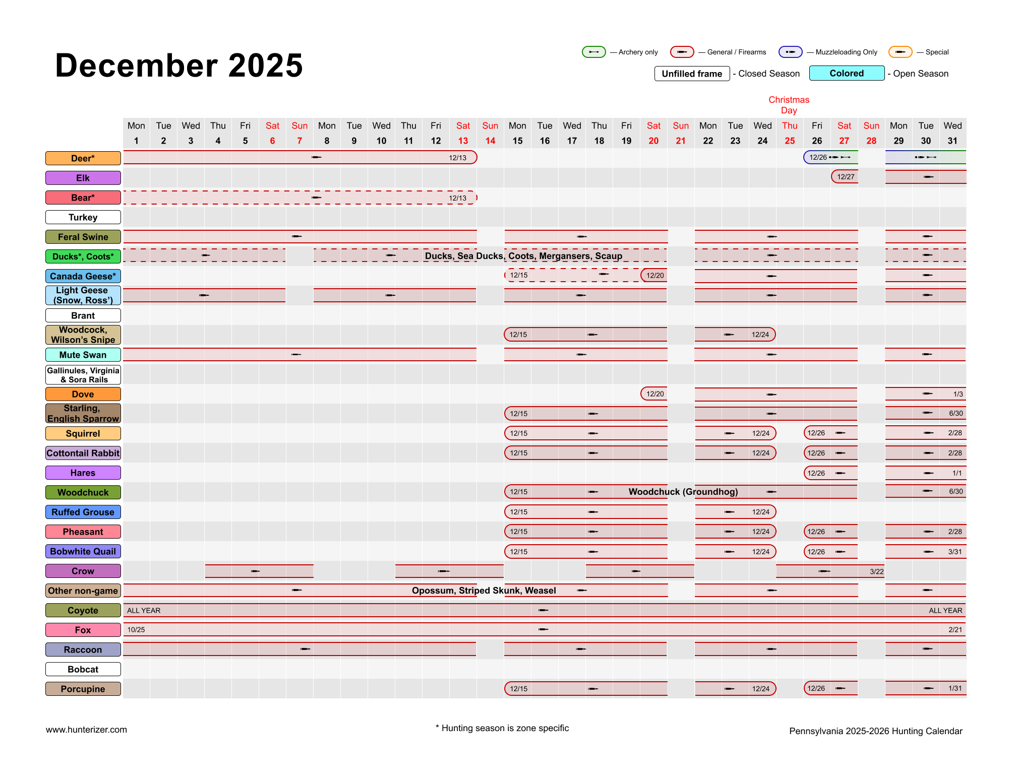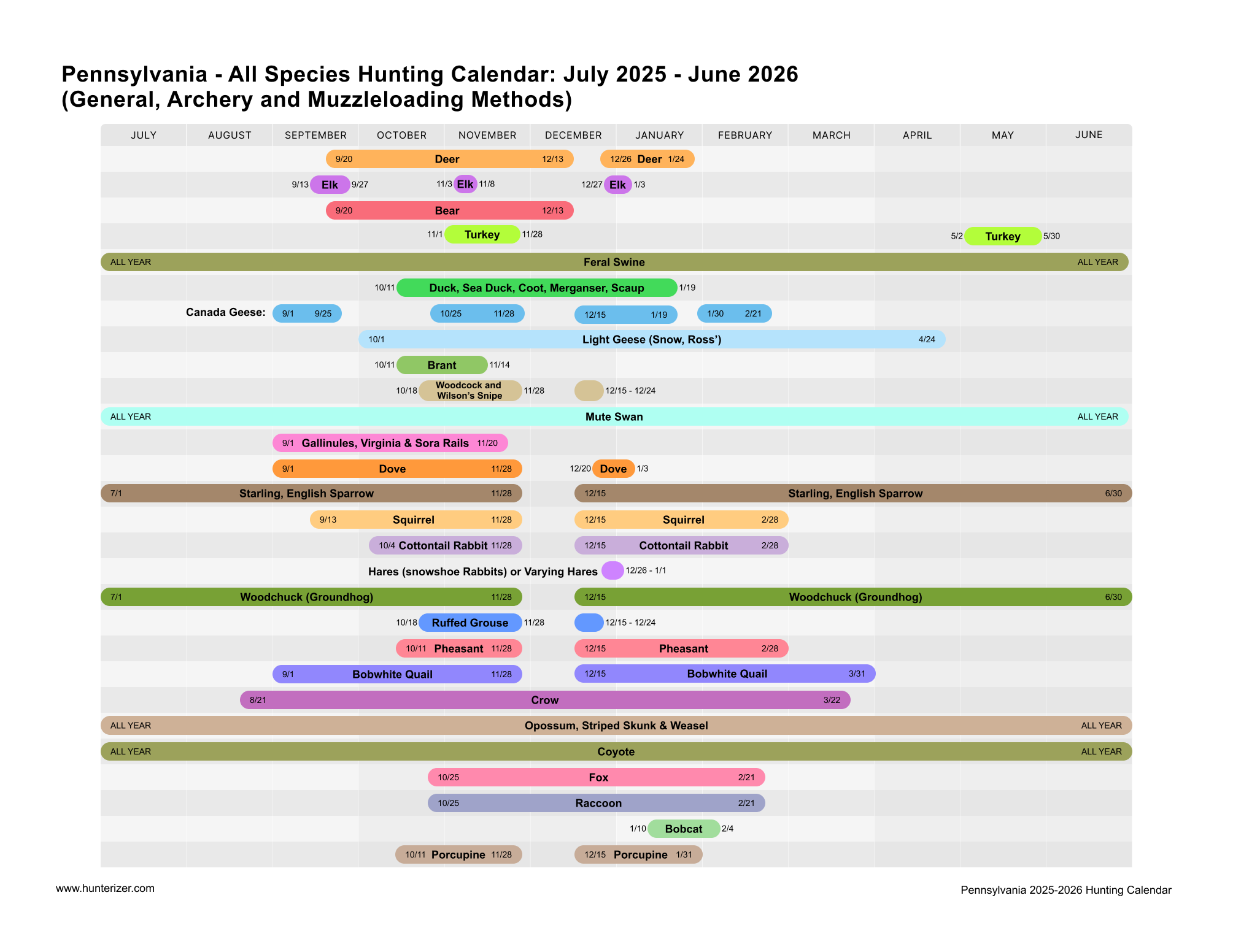 - Open season dates for 41 species: Detailed calendar for Pennsylvania hunting seasons for all species (deer, bear, turkey, waterfowl, upland game birds, small mammals, furbearers and more) for license year of 2025-2026 (July 2025 to June 2026)