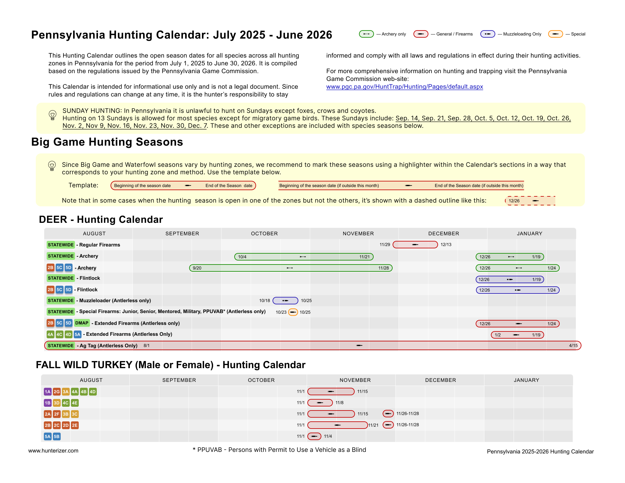 - Zone-specific charts for Pennsylvania deer, bear, turkey and waterfowl hunting seasons